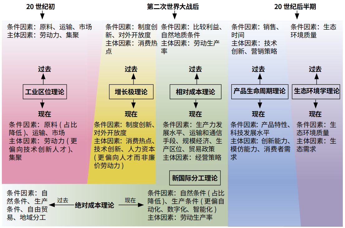 第二次世界大战后的全球城市化与工业化浪潮推动了工业园区的快速发展,园区产业空间组织以高效完成经济体系重构为核心导向。这一时期的园区产业空间组织理论带有明显的功利主义色彩,如增长极理论、新国际分工理论、产品生命周期理论等。增长极理论最早由佩鲁提出,他认为制度创新点、对外开放度、消费热点等是促进经济增长的积极因素和生长点,并且这些因素能产生区位经济、规模经济、外部经济效应。新国际分工理论包括亚当·斯密的绝对成本论和大卫·李嘉图的相对成本论两大流派。绝对成本论认为,利用自然优势和后天获得的优势,能在生产特定商品时节约劳动时间,形成成本优势,从而在国际市场上具备价格优势;相对成本论则强调土地生产力与劳动生产力的差异,认为应依据土地和劳动力的自然属性来布局产业,主张通过比较利益来抵消空间运输成本,将产业布局在最能充分利用资源的地区。产品生命周期理论由Raymond Vernon提出,他认为产品要经历开发、引进、成长、成熟和衰退的周期。该理论侧重从技术创新、技术进步和技术传播角度分析国际贸易的基础,将国际贸易中的比较利益动态化,并研究产品出口优势在不同国家间的传导。
