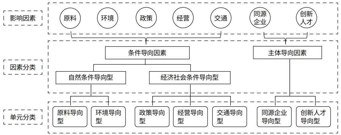 基于这一思路,研究将原料、环境、政策、经营、交通、同源企业、创新人才7类影响因素分为条件导向因素和主体导向因素两大类。条件导向因素包括原料、环境、政策、经营、交通5类客观因素,且可根据因素的自然社会属性进一步划分为自然条件导向型因素(原料和环境因素)和经济社会条件导向型因素(政策、经营和交通因素)。主体导向因素包括同源企业和创新人才两大主观因素。根据以上分类,可以建构涵盖2个大类、7个小类的产业空间单元(图3)。