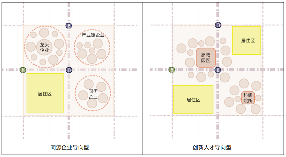 主体导向型单元包括同源企业导向型单元和创新人才导向型单元(图6)。同源企业导向型单元依托企业集聚获取竞争优势,单元内的企业在技术和产品工艺等方面具有同源性,并通过分工合作形成企业集群网络,既包括横向上的同类型企业集群,也包括纵向上的上下游产业链企业集群;创新人才导向型单元中的创新人才更倾向于高层次技术创新人才,包括工程师、技术人员、产业工人等,他们从事各种创新创业工作,因此该类单元内的企业多围绕高教园区和科研院所布局。