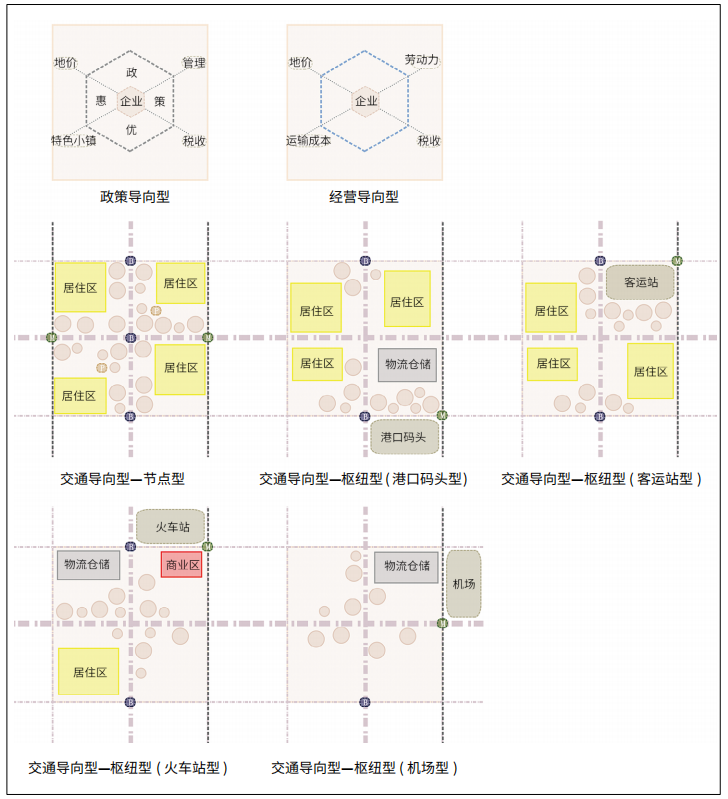 经济社会条件导向型单元包括政策导向型单元、经营导向型单元和交通导向型单元(图5)。在经济一体化的持续影响下,开发区过去赖以生存的政策优势趋于弱化,新时期的政策导向型单元中的政策更加突出企业自主创新、高新技术与产业化等创新驱动倾向。经营导向型单元并非一味强调降低生产成本,而是更侧重于通过制定企业经营发展战略,从战略角度对材料、劳动力、运输等方面的成本进行控制,从而形成企业竞争优势。相较于传统资源制约型产业,高新技术产业和战略性新兴产业对运输条件并无特定要求,因此交通导向型单元更关注运输方式的安全性、时效性和便捷性,陆路快速交通和航空运输所占比重将越来越大,这类单元对通信设施的依赖性和要求也越来越高。根据交通设施的规模大小,交通导向型单元可分为节点型和枢纽型两类。枢纽型又可进一步细分为港口码头型、客运站型、火车站型和机场型4种。