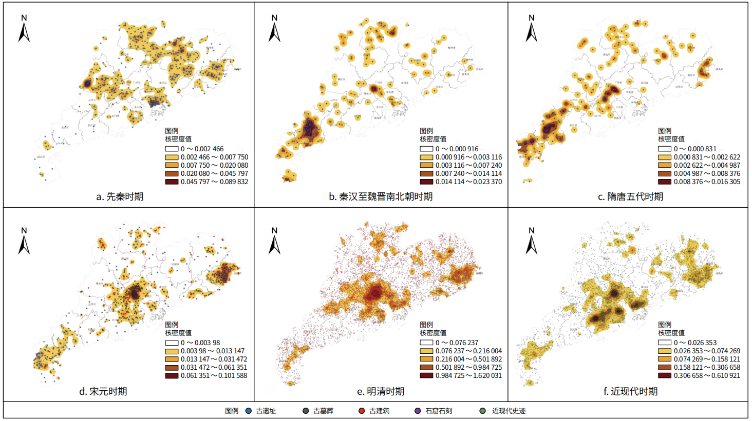 广东不可移动文物的演变经历了“发育—发展—繁育”3个阶段。①发育期(先秦时期),文物以古遗址为主,主要分布在山区及沿海地区,分别以半地穴式建筑和干栏式建筑遗址为主,肇庆市域范围内的古遗址较多(图4-a)。②发展期(秦汉至宋元时期),文物数量平稳增加,类型以古遗址和古墓葬并重,趋于多样化,集聚中心由粤西向广佛、潮汕、湛江3大中心并立转变(图4-b~图4-d)。③繁育期(明清至近现代时期),文物数量剧增,尤其是明清时期,文物数量达17015项,占文物总数的67%;文物类型从以古遗址、古墓葬为主向以古建筑、近现代史迹为主的多样化类型转变,文物分布范围趋于广泛,集中分布在广府珠江三角洲和潮汕平原地区(图4-e,图4-f)。明清时期,珠三角和潮汕地区已成为广东经济发展中心,而到了近现代时期,又作为反侵略战争重要区域、近代重要侨乡文化区域,遗留下来的文物数量相对较多。
