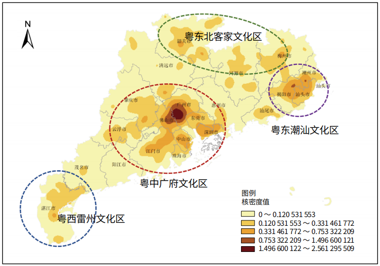 核密度分析结果显示,不可移动文物“中密周疏”,集中分布于珠江三角洲地区和潮汕平原地区,呈现“一心多点,片区集聚”的总体空间格局。其中,广州—佛山地区是文物分布的高密度核心区,潮汕地区为次核心区。文物分布的片区可分为粤中广府文化区、粤东潮汕文化区、粤东北客家文化区和粤西雷州文化区(图2)。