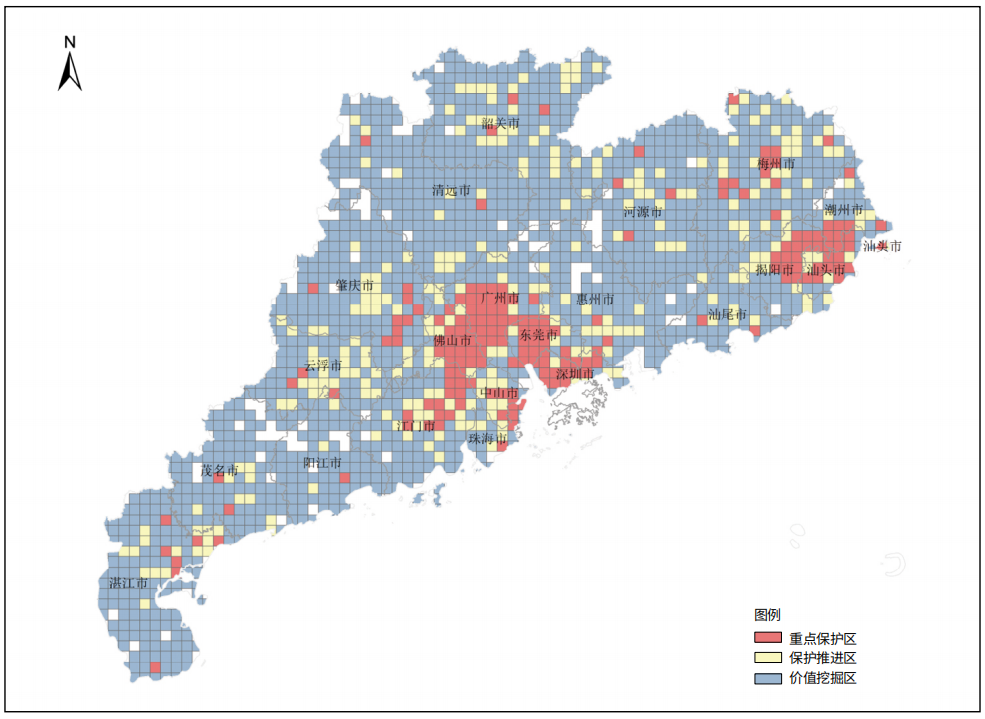 根据广东不可移动文物的时空分布以及文物之间的等级差异划定不同侧重保护区,明确每一类保护区的要求及重点,并制定相应策略。将不同等级的文物分为高等级文物(国家级、省级)、中等级文物(市县级、区级)及低等级文物(未定级)3类,并根据保护等级差异分别制定半径为100m、50m及25m的缓冲区作为文物的保护范围。修正空间重叠的区域后,统计每个网格内保护范围的面积总和,剔除未涵盖文物保护范围的网格,依据面积总和的大小将网格分为3类(图7)。①重点保护区,涵盖大多数高等级文物,也是各级文物分布密度较高、相对集中的区域,主要分布在珠三角的广州—佛山、东莞—深圳、潮汕地区等地。重点保护区的文物保护情况一般较好,价值较高,应在保护的前提下进一步考虑如何发挥文物的利用价值,并辐射周边低等级文物的保护与利用。②保护推进区,涵盖大多数中等级文物及少数分散分布的高等级文物,主要分布在重点保护区的外围如肇庆、云浮等。保护推进区应重视区域范围内的高等级文物,并加强对中低等级文物的巡查工作,合理置入功能,减少文物空置率。③价值挖掘区,文物分布的密度较低且主要为未定级不可移动文物,应做好低等级文物的基本普查工作,完善文物基本信息,进行价值评定,保护力度根据价值有所侧重,应保尽保。