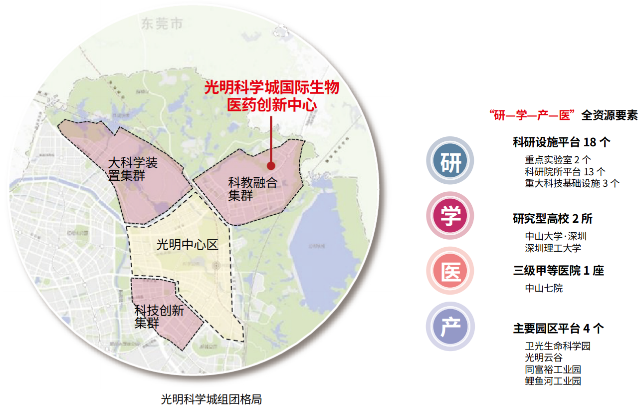 规划片区紧邻光明科学城的脑模拟脑解析、合成生物、精准医学影像等生命科学重大装置,拥有中山大学·深圳、深圳理工大学2所研究型高校,以及深圳湾实验室、深圳医学科学院等前沿科研平台,在生物医药的基础科研、应用研究等领域已经具备较好的发展基础。然而,针对药物发现、动物实验、临床试验等生物医药创新链环节仍较为缺失。因此,规划重点增设药物工程研究中心、合成生物研究所等药物发现平台,中大动物实验中心、深圳理工大学动物实验室等动物实验平台,以及中山七院临床试验中心等临床试验平台。通过打造这些专业创新平台,引入专业科创资源,推动生物医药创新链不断完善和发展。