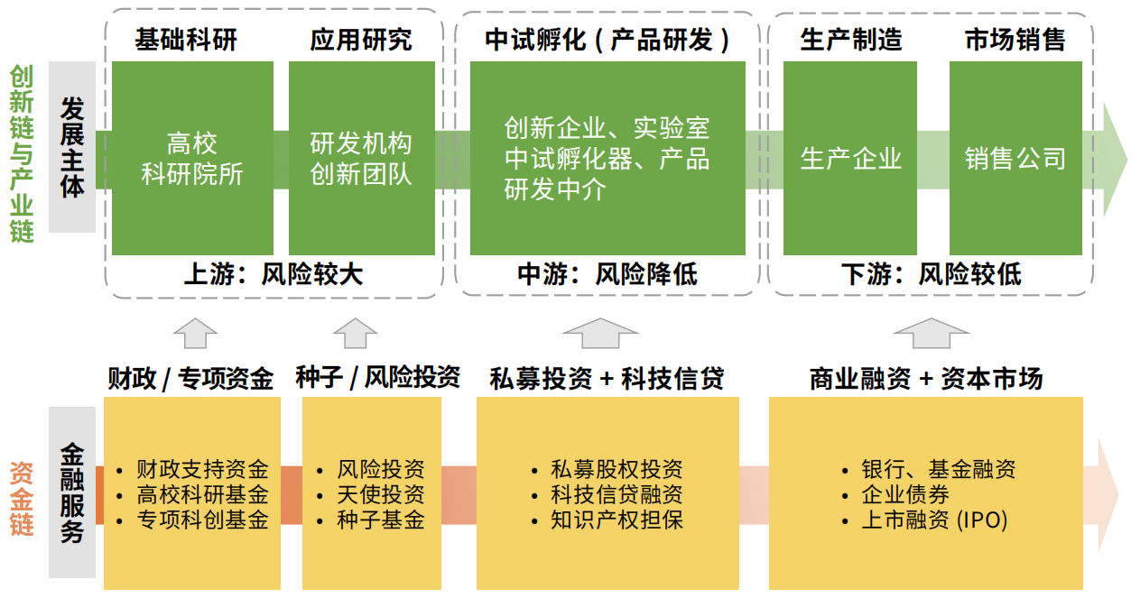 创新链、产业链的不同主体对资金类型的需求不同。例如:从事基础科研的研究团队由于科研成果产出的不确定性,往往缺少社会资本的关注,那么就需要通过政府财政支持或专项基金支持等方式帮助他们实现科研成果产出;从事转化制造的生产企业则通常需要借助银行贷款、企业债券等融资方式来扩大企业的规模化生产。因此,创新园区需要针对创新链、产业链不同主体的资金需求差异,建立专门的资金链对接公共平台,由政府牵头,集合多元金融机构,为不同主体与资金供给方构建精准化的对接通道,以满足资金发展需求。资金链对接公共平台发挥中介服务作用,围绕创新链、产业链不同环节的主体需求,形成从科技研发、成果转化到产品产业化的全过程资金支撑链条。在资金链的推动下,创新链的成果得以向产业链延伸,并逐步孕育出新兴产业或未来产业。围绕产业链上下游相互关联的企业机构形成纵向合作,可以促进产业链上各要素的有效配置,提升产业的运行效率和创新能力。
