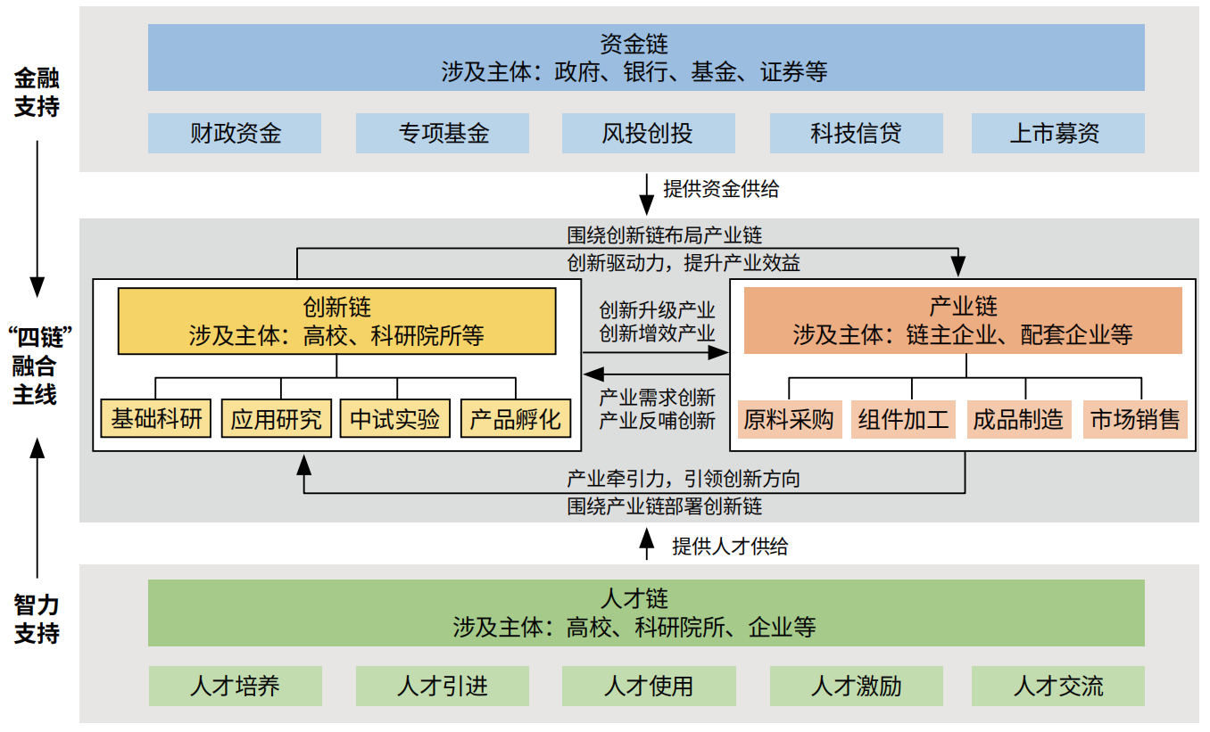 创新链是指从基础科研到成果转化的全过程,核心是创新主体在不同创新环节开展知识、技术研究过程中的协作,涉及创新活动从科学基础到成果实现,通过知识、技术等创新要素的流动与整合,形成价值递增的链条协作模式,一般涵盖“基础科研—应用研究—中试实验—产品孵化”等主要环节。产业链是产品孵化后进行规模化生产过程中所涉及的生产与服务的全过程,是依据上下游协作关系形成的链条式产业集群,一般涵盖原材料采集、中间产品加工、最终成品制造、市场销售服务等环节,即产供销的全过程。创新链和产业链被认为是经济发展中最为重要的两条链式结构,二者深度融合,形成“基础科研—应用研究—中试实验—产品孵化—生产制造—销售服务”的创新经济链条。资金链是为满足上述创新经济不同环节的资金需求而形成的资金链条,包含政府资金和社会资金两大类,为创新链和产业链上的各类主体提供精准有效的资金支持。人才链是贯穿人才培养、引进、使用和激励等全过程的链式结构,为创新链、产业链和资金链发展提供人才智力资源。