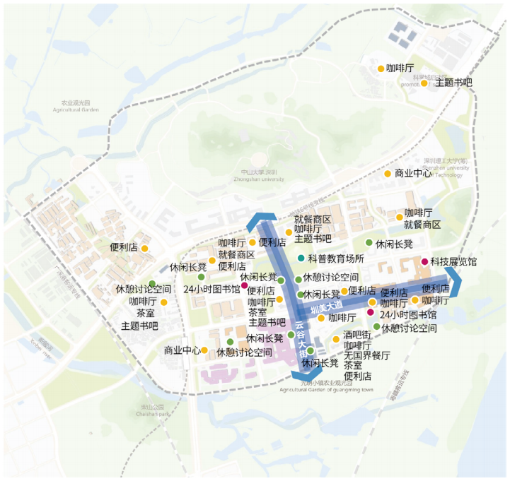 针对上述人才需求,规划提出打造3大优质服务场景(图9~图11),通过优质配套环境吸引并留住人才。首先,构建儿童陪伴友好场景。结合深圳市《儿童友好公共服务体系建设指南》,从健康、教育、文体、出行等方面提出建设优化指引,重点增设儿童科普中心、儿童文化剧场、未成年人保护工作站等,推动建设儿童友好街区。其次,构建交流互动友好场景。通过塑造正式交流场所、非正式交流场所等两类交流互动场所,为科研人才提供多元化的交流互动场景,激发创想互动。其中:正式交流场所包括科技会馆、学术交流厅等,服务于国内外有关生命科学发展的研讨会、学术会等会议;非正式交流场所将依托云谷大街布局无国界餐厅、咖啡厅、会客茶室等国际化的创意商业空间,促进科研人才在工作之余进行非正式的创享交流。最后,构建健康运动友好场景。规划提出依托城市绿道,打造科技运动慢跑环,串联沿线的篮球场、足球场、运动公园等,形成15min范围的运动网络,为科研人才提供多元化的运动空间。