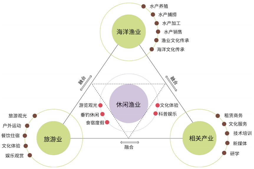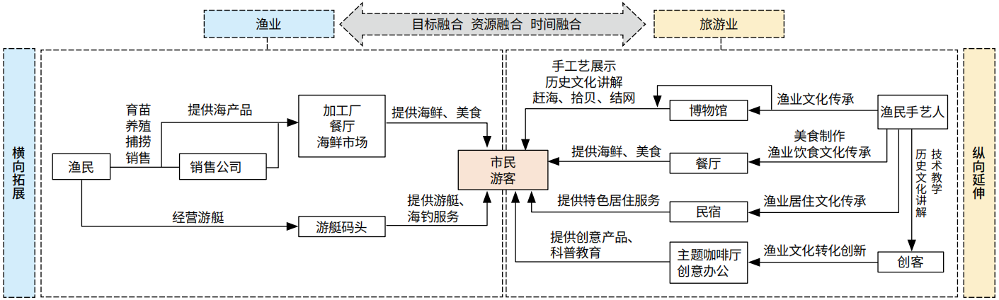 渔旅融合即渔业、旅游业及相关产业融合发展,以渔文化为基因、以旅游为形态、文旅融合发展的一种典型模式。这一过程涉及产业间功能互补与扩展,以实现产业的相互渗透与交叉重组以及资源要素的有效跨境配置,从而扩大产业链和提升价值链(图1)。渔旅融合的概念最早应用于乡村振兴,为带动农村经济发展和提高渔民收入提供了新思路。2022年农业农村部发布的《“十四五”全国渔业发展规划》特别强调,当前传统渔业已进入现代化转型的关键期,将渔业资源与自然资源、文化旅游等进行创新融合,成为由一产向一二三产业协同发展转变的新趋势。在城市存量更新时代,服务与创新驱动是大势所趋,将渔旅融合的理念植入滨海中心城区渔港码头的转型实践,势必为该区域的经济社会发展注入新动能。