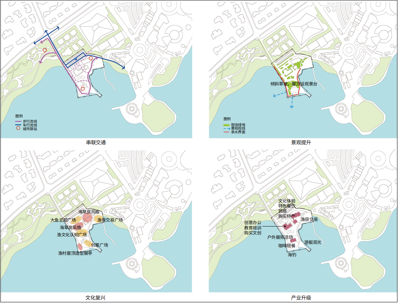 围绕前述更新思路,基于渔旅融合更新模式,本文从要素更新、水城互动、文化复兴、产业升级、协同管理5个维度提出徐家麦岛渔港码头渔旅融合更新策略,并以概念性规划方案引导后续更新设计(图3)。