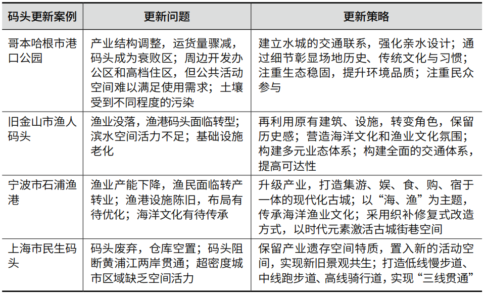 “城市更新”源于1949年的《美国住宅法》,发展至今已走向人本主义更新、小规模渐进式更新、多层面综合更新的模式,并从地块改造提升为区域整体复兴,进入了全新的“城市复兴”阶段。城市更新在20世纪90年代才受到国内学术界的普遍关注。目前,我国的城市更新模式也已从单一物质空间提升转向经济、社会、空间、文化等多层面的综合更新。国内外在中心城区码头更新的理论与实践探索方面已形成多层次成果(表1),这对相关实践具有一定的借鉴意义。