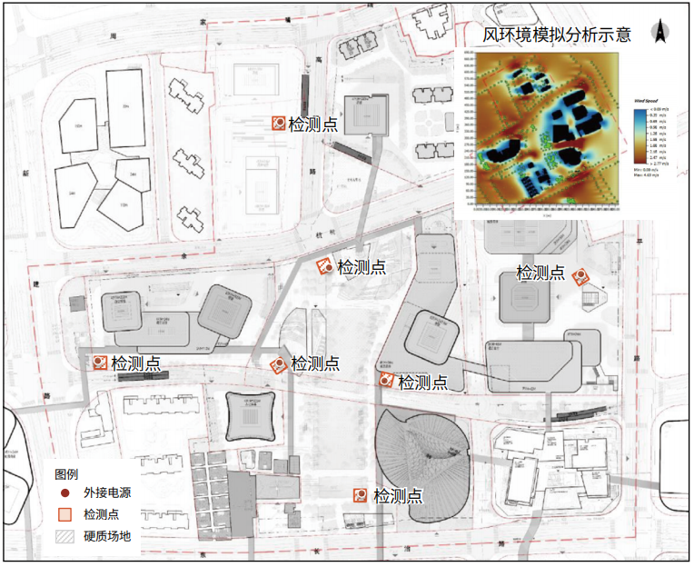 针对疫情中后期、常态化防控时期的检测需求,考虑到部分工作职员选择在家附近完成检测,因此将常态化防控时期的检测目标设定为在72小时内完成最高每日活动人口数量的30%(5.4万人)的人员检测,每分钟大约需检测30人(每天检测10小时)。按照每处检测场地设置2个采样台的标准,防疫规划设置了7处小型室外检测场地,同时为了保证采样台前排队20人、人与人前后左右间距1.5m的空间,每个室外检测场地面积为90m2。小型室外检测场地根据风环境模拟结果,布局在风速适中的区域,并且需考虑在商务区中的空间分布均衡性(图3)。