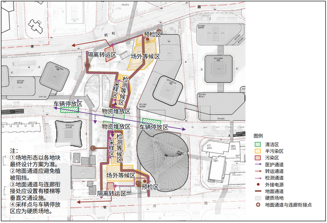在场地设计方面,被划定为“三区”的区域以硬质场地和草坪为主,活动场地倾向于集中布置,以满足集中开阔的要求。“三通道”特别是检测通道需结合绿地内的连廊布局,以保证能够全天候使用。