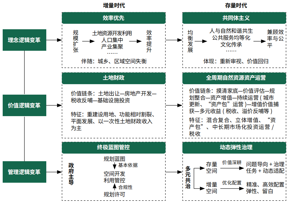 增量时代,政府在城市发展过程中发挥着主导作用。存量时代,开发格局难以发生结构性变革,需要从规模、指标、空间管控转向自然资源资产管理和国土空间高效能治理,城市发展的根本动力从“政府主导”转向“多元共治”,政府的核心职能转向顶层设计、底线管控、风险防控,以及锚定公共利益的规则设定,且身份转变为空间引导者、资源资产管理者、用途管制及市场规则制定者,管理逻辑也随之发生变化。