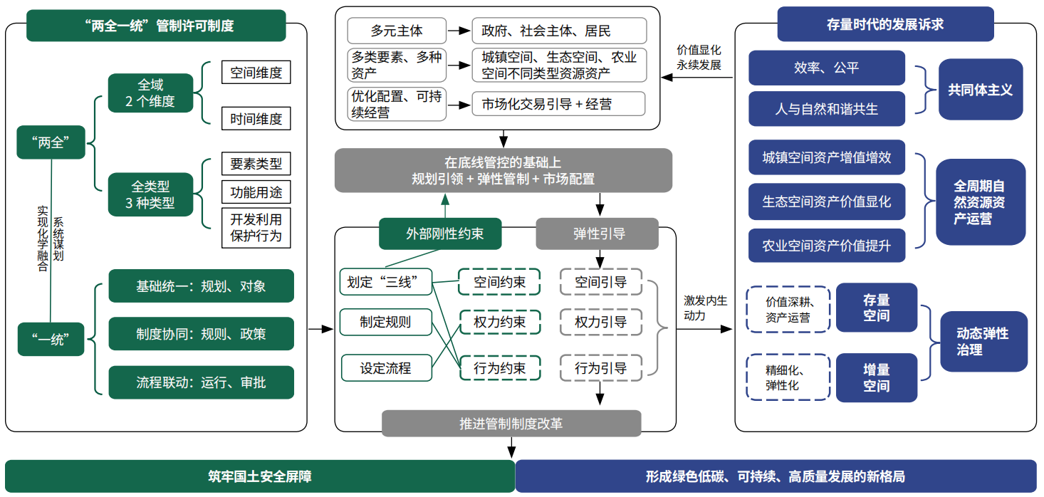“全域全类型、统一协调”的具体内涵可从时空覆盖完整性、要素类型全面性、制度体系协同性3个维度进行分析。“全域”可理解为“全地域、全时间”维度覆盖,包括跨区域协同以及陆海、城乡、地上地下等所有地域空间的衔接,还包括“存量优化+增量严控”全周期管理,覆盖规划编制、审批许可、开发建设、运营维护、生态修复、公建配套等全流程。“全类型”可理解为“资源类型、功能用途、开发利用和保护类型的全覆盖”,强调“全要素、全空间统筹”,既包括土地、森林、草原等自然资源类型,也包括地上地下空间、陆海空间一体化管制,还包括城镇空间内的存量更新建筑用途变更以及土地混合复合利用、生态空间的非建设活动等。“统一协调”可总结为基础统一、制度协同、流程联动,即管制目标、底线、指标、规则、流程、信息化管理的整合优化、内部融合、协同高效,包括不同层级、不同部门的统一协调,以及内部空间准入、用途转用、规划许可等不同环节之间和各环节内部的统一协调。可见,“全域全类型”解决了“管什么”的问题,“统一协调”解决了“怎么管”的问题,通过空间约束、权力约束、行为约束,实现空间权利与管制责任、发展需求与底线约束的统一。