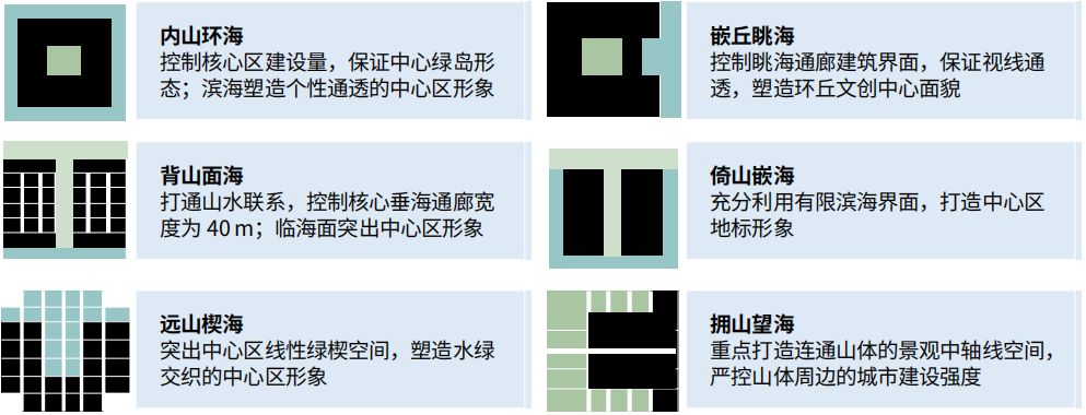 大连城市中心地区内部和外部嵌有大型自然山海景观,呈现出鱼骨状分布格局。为提升“鱼骨蔓延”这一空间基因的辨识度,打造“一脉入海,连岬塑湾”的山海形胜格局(图5)。例如,以纵贯全城的绿心为脉络,塑造垂海绿楔,打通山岭之间的联系通道,进而依托市域边界“两岬夹一湾”的独特地理特征,利用山岭及绿楔对9个相互联系的湾区组团进行分隔,形成6种城市空间组合模式(图6)。通过控制视廊周边区域的城市建设强度,保证望海视廊通透,从而保持良好的山水关系与城市形象。