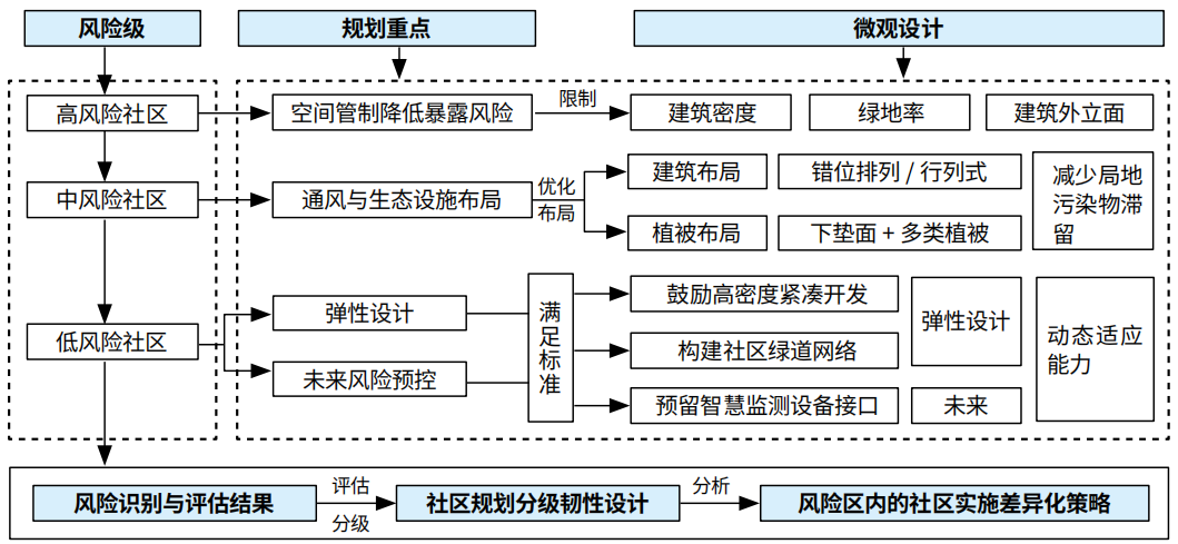 基于风险识别与评估结果,社区规划需实施分级暴露防控设计。高风险社区通过严控建筑密度、提升绿地率、在社区主要入口设置空气净化廊架,降低暴露风险。中风险社区需侧重通风与生态设施布局,建筑宜采用错位排列或行列式布局,以提高夏季主导风的穿透率,减少局地污染物滞留,并依托植被与设施实现降温滞尘。低风险社区则以弹性设计与未来风险预控为主,在符合日照标准的前提下,鼓励高密度紧凑开发,提升土地利用效率;构建社区绿道网络,形成连续的微气候调节带;为应对未来可能的风险变化,建立社区韧性数据库,定期评估策略实施效果,并根据气候变化和社区发展进行动态调整。见图8。