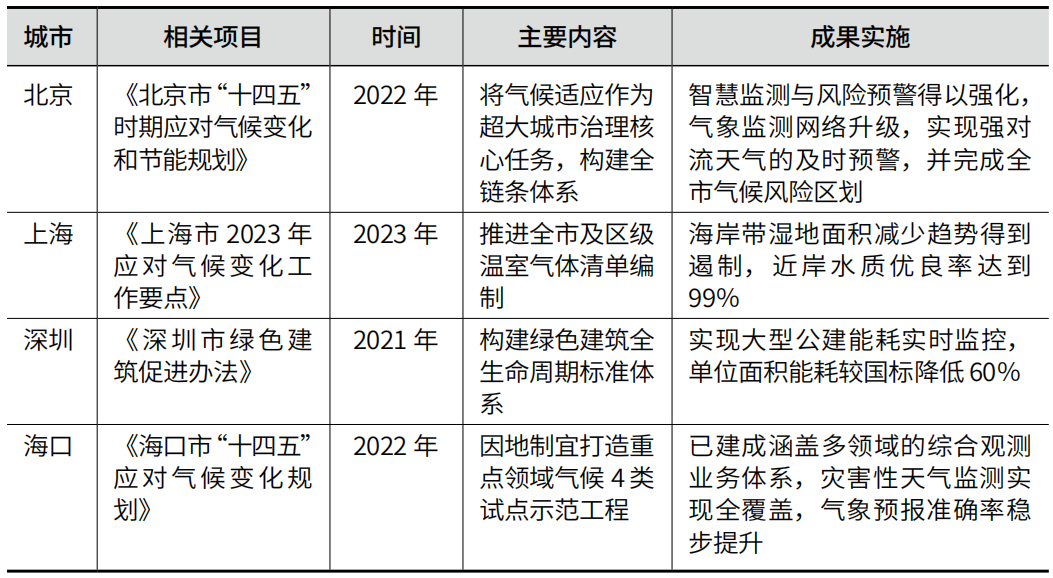 自2017年气候适应型城市试点推行以来,北京、上海、深圳、海口等城市开展了相关实践(表1)。城市气候适应性已成为空间规划领域的核心议题,国内外学者围绕城市承污韧性的理论建构与实践路径展开了系统性探索。研究内容主要集中在以下4个维度:①气候风险评估与脆弱性空间识别。通过构建多源数据融合的评估模型,对高温热浪、大气污染、极端降水等因素的暴露风险进行量化分析,识别脆弱性空间的时空分布特征。在大气污染领域,结合污染物扩散模型与人群活动轨迹,量化呼吸暴露风险的空间异质性,为承污韧性分区管控提供依据。②城市空间形态与气候适应性的耦合机制。研究聚焦于城市布局、建筑肌理、功能混合度等空间要素对气候过程的影响。通过对海绵城市、通风廊道等的实证分析,证实合理的空间形态设计能够增强城市系统对极端气候的缓冲能力。③基于自然的解决方案及其规划应用。在国外研究方面,荷兰“韧性三角洲”规划、新加坡“城市花园”战略等案例表明,将绿色基础设施纳入空间规划体系,可显著提升城市应对极端气候的能力。国内研究则结合国土空间规划中的生态保护红线、生态安全格局等,探索自然系统与人工系统的协同优化路径。④多维度韧性协同体系。随着风险的复杂化,研究逐渐从单一污染物防控转向“减缓—适应—转型”的多目标协同,提出整合多领域的综合策略。在规划层级上,强调国土空间规划体系中的多层级联动;在实施路径上,倡导建立跨区域协调机制,为区域尺度的气候适应性提供了经验参考。