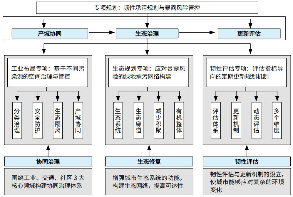 专项规划内容涵盖工业布局专项的空间治理与管控、生态规划专项的绿地承污网络构建,以及韧性评估专项的定期更新规划机制(图9)。