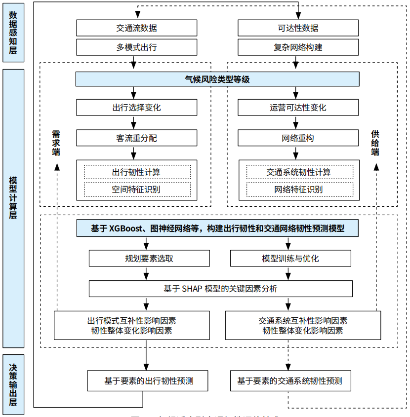 在气候变化背景下,极端天气事件(如暴雨、高温、海平面上升等)愈发频繁,且强度不断加大,这使得传统交通系统的脆弱性被进一步放大。为突破现有研究在评估维度单一化、动态机制缺失化、要素关联碎片化的局限,本研究提出需求韧性与供给韧性动态交互机制技术。基于韧性理论,从需求侧与供给侧双重视角出发,聚焦于气候风险动态监测、AI驱动韧性分析与规划要素协同优化,系统评估城市交通系统在气候变化背景下的适应能力。见图1。