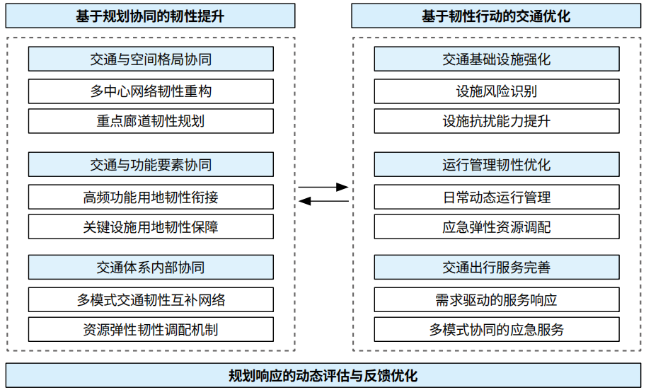 然而,既有研究与实践仍存在显著短板。在评估层面,需求侧与供给侧的研究相对割裂,缺乏对两者交互作用的深入探讨,导致无法精准匹配极端气候下动态变化的出行需求;在规划实践中,现有方法大多局限于基础设施加固或网络布局优化的单一维度,忽视了供需动态平衡机制,未能系统性关联韧性形成机制与规划要素,难以有效识别供需失衡的关键风险节点,进而制约了规划措施的落地实效。
