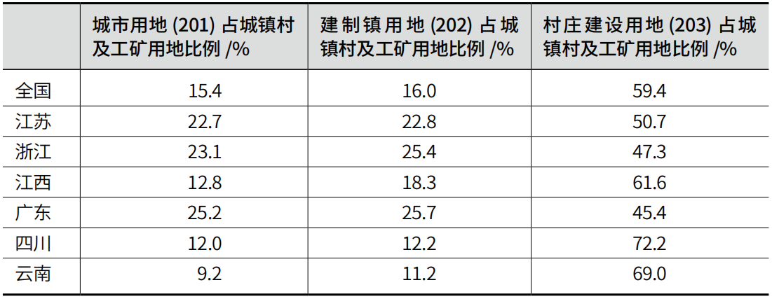 表1 2022年全国及部分省份的城、镇、村用地占比