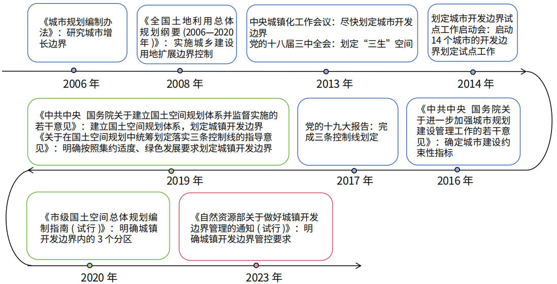 2018年机构改革后,城镇开发边界的定义和内涵逐步明晰。城镇开发边界既涉及资源环境的节约和保护,也涉及对城镇和乡村建设发展规律的认识。2019年1月,构建国土空间规划体系的纲领性文件——《中共中央 国务院关于建立国土空间规划体系并监督实施的若干意见》发布,明确了城镇开发边界是国土空间规划体系中的重要控制线之一。2023年,《自然资源部关于做好城镇开发边界管理的通知(试行)》进一步明确了城镇开发边界局部优化的几种情形,各省份也陆续出台了相关实施细则。