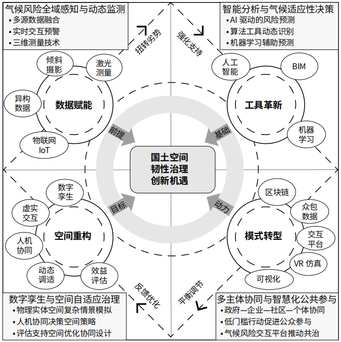 摘 要立足数智时代的技术变革特征,系统探讨气候适应性规划与国土空间韧性治理的现实机遇、风险挑战及实践路径。通过解构面向气候适应的国土空间韧性治理的核心矛盾,剖析数智技术驱动下治理创新的机遇所在。同时,揭示数智技术应用于国土空间气候韧性治理的3大挑战,即技术依赖、制度非正义与虚实空间冲突。在此基础上,结合国际经...