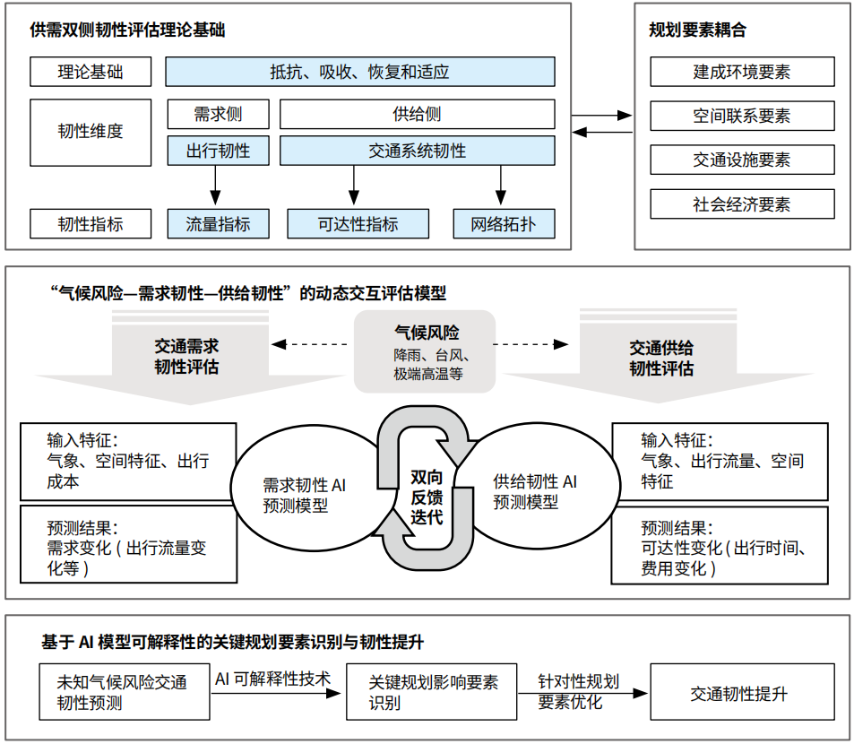 摘 要在对当前交通气候适应体系存在的评估维度割裂问题进行系统剖析的基础上,依托需求和供给交互理念,提出一种人工智能交通韧性评估框架。基于这一框架,深入探索量化评估与韧性提升的技术方法,突破了传统单一维度评估以及缺乏动态反馈与协同优化机制的局限。同时,在该框架指导下,提出气候适应型交通韧性规划协同与提升策略,旨...
